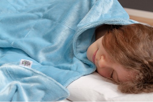Miękka i ciepła kołderka obciążeniowa z przemiłego w dotyku pluszu Minky w delikatnym, błękitnym kolorze wypełniona mikrokulkami szklanymi.