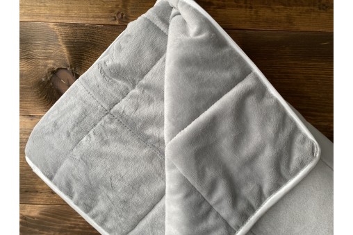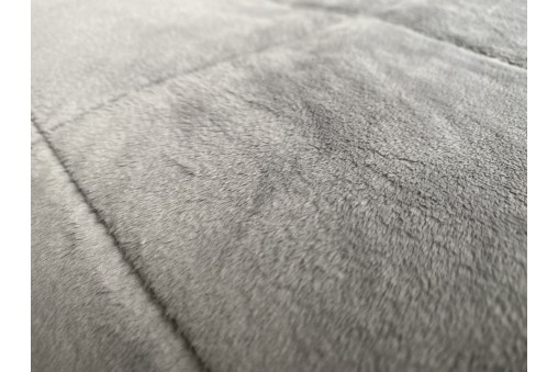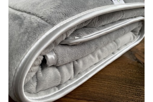 Miękka i ciepła kołderka obciążeniowa z przemiłego w dotyku pluszu Minky w delikatnym, srebrnym kolorze wypełniona mikrokulkami szklanymi.