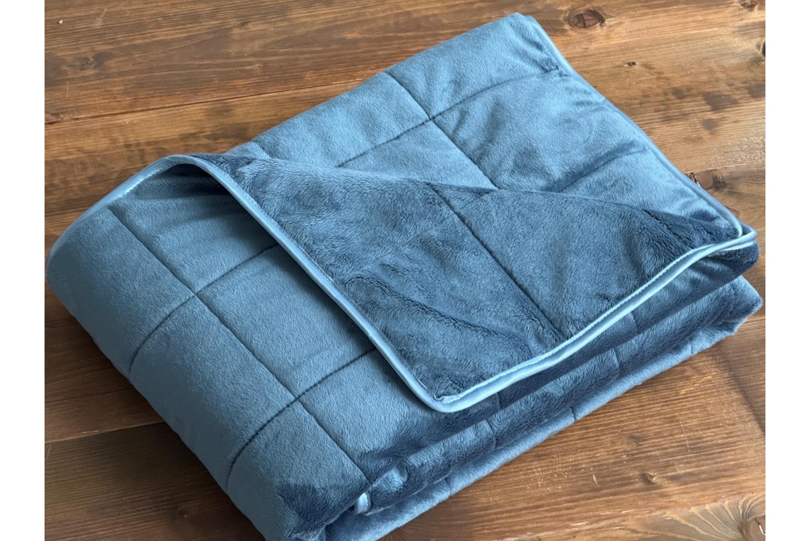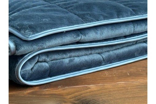 Miękka i ciepła kołderka obciążeniowa z przemiłego w dotyku pluszu Minky w przepięknym i najmodniejszym kolorze vintage indygo, wypełniona mikrokulkami szklanymi.